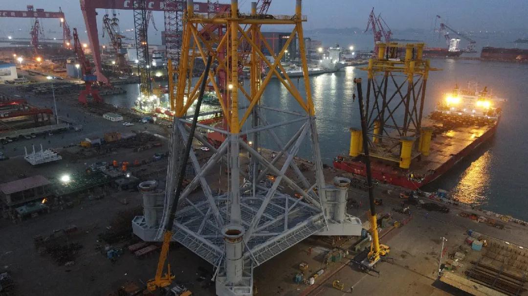 近日,由廣東省本土企業(yè)——廣州文船重工有限公司承建的中廣核惠州港口—海上風(fēng)電場項目220KV海上升壓站導(dǎo)管架基礎(chǔ)在南沙龍穴島生產(chǎn)基地順利交付。